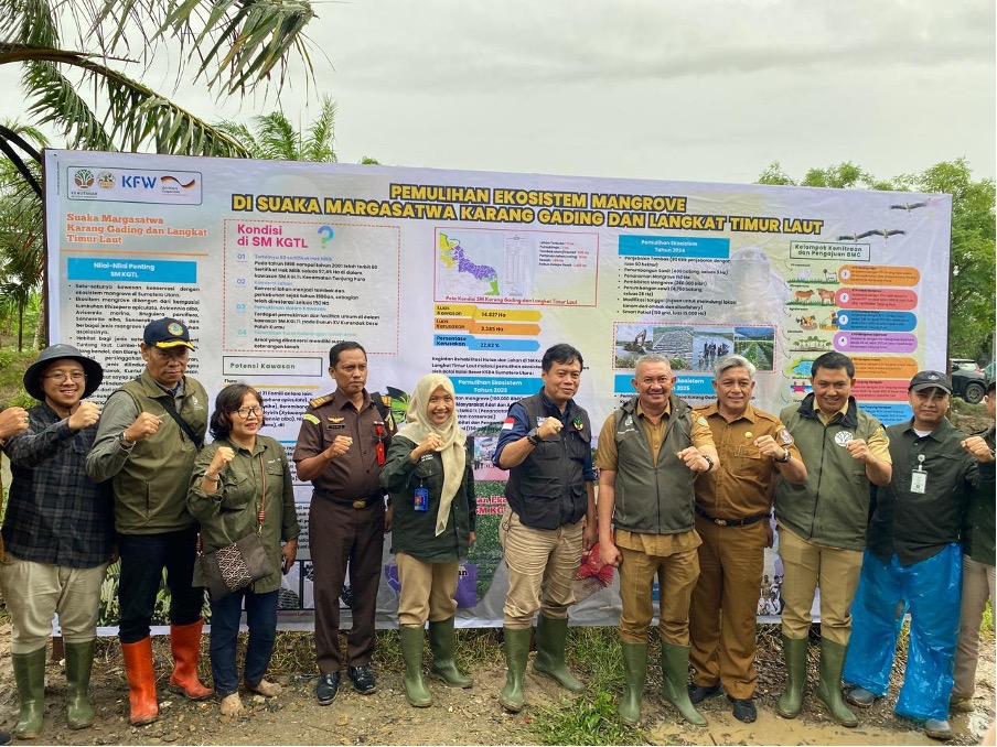Sedangkan untuk 2025, pemulihan ekosistem dilakukan melalui kegiatan penanaman mangrove di area bekas lahan kebun sawit seluas 103 Ha dan lahan bekas tambak seluas 197 Ha, pembibitan mangrove di Desa Karang Gading dan Desa Paluh Kurau sebanyak 1.415.700 batang, Persetujuan Atas Dasar Informasi di Awal Tanpa Paksaan (PADIATAPA) dan rencana teknis pemasangan patok area penanaman.