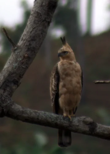 Elang yang bertubuh sedang sampai besar, langsing, dengan panjang tubuh antara 60-70 cm (dari ujung paruh hingga ujung ekor). Kepala berwarna coklat kemerahan (kadru), dengan jambul yang tinggi menonjol (2-4 bulu, panjang hingga 12 cm) dan tengkuk yang coklat kekuningan (kadang tampak keemasan bila terkena sinar matahari). Jambul hitam dengan ujung putih; mahkota dan kumis berwarna hitam, sedangkan punggung dan sayap coklat gelap. Kerongkongan keputihan dengan garis (sebetulnya garis-garis) hitam membujur di tengahnya. Ke bawah, ke arah dada, coret-coret hitam menyebar di atas warna kuning kecoklatan pucat, yang pada akhirnya di sebelah bawah lagi berubah menjadi pola garis (coret-coret) rapat melintang merah sawomatang sampai kecoklatan di atas warna pucat keputihan bulu-bulu perut dan kaki. Bulu pada kaki menutup tungkai hingga dekat ke pangkal jari. Ekor kecoklatan dengan empat garis gelap dan lebar melintang yang tampak jelas di sisi bawah, ujung ekor bergaris putih tipis. Betina berwarna serupa, sedikit lebih besar. Iris mata kuning atau kecoklatan; paruh kehitaman; sera (daging di pangkal paruh) kekuningan; kaki (jari) kekuningan. Burung muda dengan kepala, leher dan sisi bawah tubuh berwarna coklat kayu manis terang, tanpa coretan atau garis-garis.