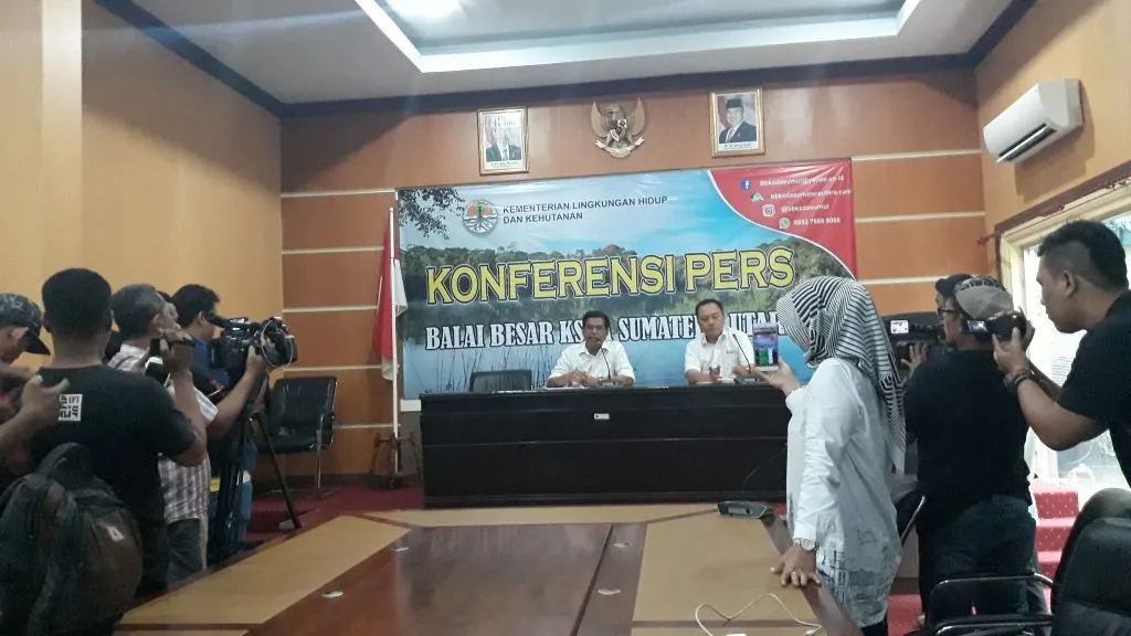 Medan, 24 Juli 2019. Sehubungan terperangkapnya 1 (satu) individu Harimau Sumatera (Panthera tigris sumatrae) pada kandang jebak di Desa Hutabargot Padang Lawas, pada Selasa, 16 Juli 2019, dan untuk menyampaikan informasi terkini kepada masyarakat luas, Balai Besar KSDA Sumatera Utara melakukan konferensi pers dihadapan para jurnalis/wartawan dari berbagai media, baik media cetak, elektronik maupun media on-line, pada Kamis 18 Juli 2019, di ruang rapat Balai Besar KSDA Sumatera Utara.