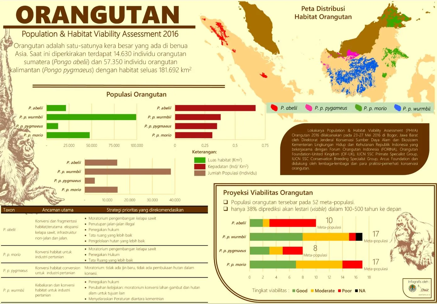 Saat ini, diperkirakan hanya terdapat 57.350 individu Orangutan Kalimantan (Pongo pygmaeus) di habitat seluas 181.692 km2 (PHVA, 2016), mencakup wilayah Kalimantan Barat, Kalimantan Tengah, Kalimantan Timur, dan Sarawak – Malaysia. Di Kalimantan Barat, diperkirakan terdapat sekitar 4.520 individu untuk sub jenis Pongo pygmaeus pygmaeus dan 15.810 individu sub jenis Pongo pygmaeus wurmbii, yang tersebar di dalam dan di luar kawasan konservasi. Di Kalimantan Barat, diperkirakan terdapat ± 20.330 individu terdiri dari Pongo pygmaeus pygmaeus sebanyak ± 4.520 dan Pongo pygmaeus wurmbii sebanyak ± 15.810 individu.